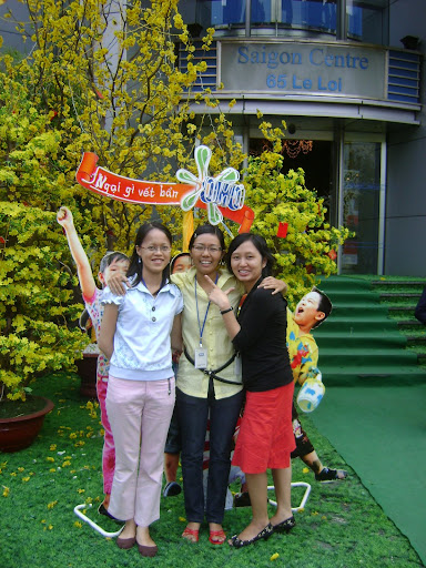 Ảnh chụp với banner quảng cáo của Omo - Tết làm điều hay - ngay trước tòa nhà văn phòng của bọn tớ